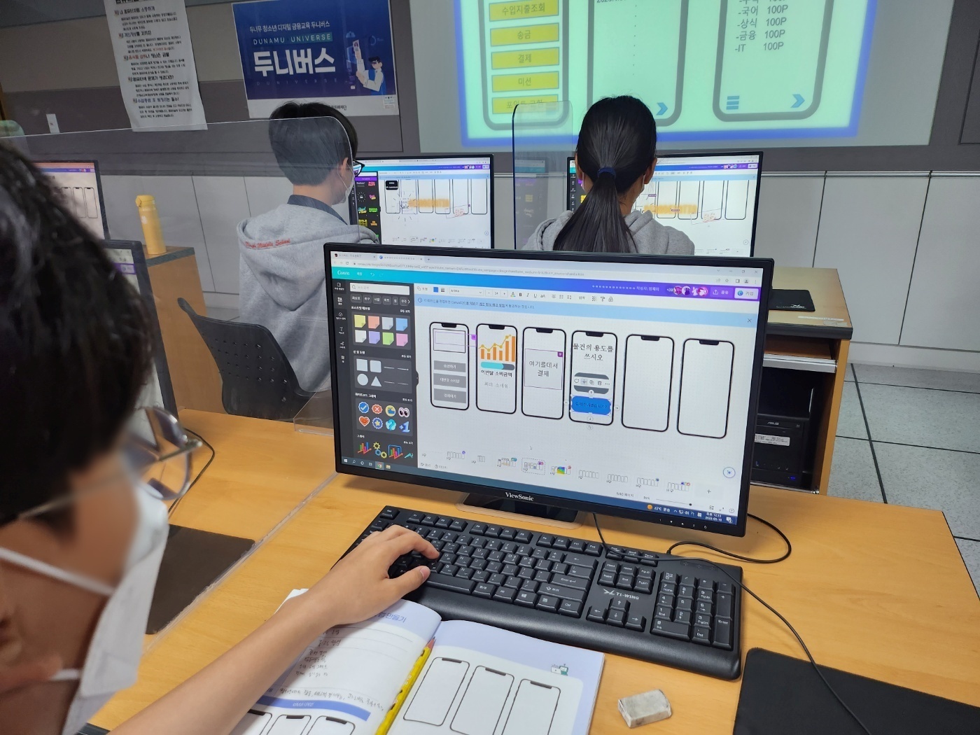 '두니버스' 교육에 참가한 중학생들이 직접 핀테크 앱을 제작하고 있다. /사진=두나무 |