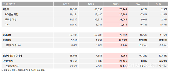 ▲ 네오위즈 2023년 2분기 매출 (자료출처: 네오위즈) |