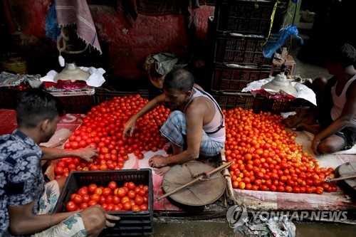 지난달 6일 인도 콜카타 도매시장서 토마토를 고르는 상인들 |