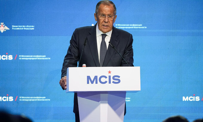 러시아 세르게이 라브로프 외교장관이 15일(현지시간) 모스크바에서 열린 국제안보회의에서 연설하고 있다. AP뉴시스 |
