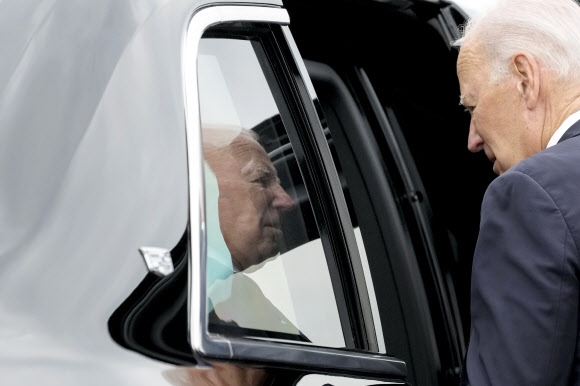 한미일 정상회의를 하루 앞둔 조 바이든 미국 대통령이 17일(현지시간) 펜실베이니아주 아보카의 윌크스바레 스크랜턴 국제공항에 착륙한 전용기에서 내려 차량에 탑승하는데 거울에 얼굴이 비치고 있다. 상당히 피곤해 보이는 얼굴이다. 아보카 AP 연합뉴스 |