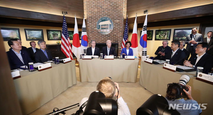 이날 윤석열 대통령과 조 바이든 미국 대통령, 기시다 총리는 한국시간으로 19일 0시 캠프데이비드에서 만났다. 이보다 앞서 만난 윤 대통령과 바이든 대통령은 별도로 한미 정상회담을 진행했다.