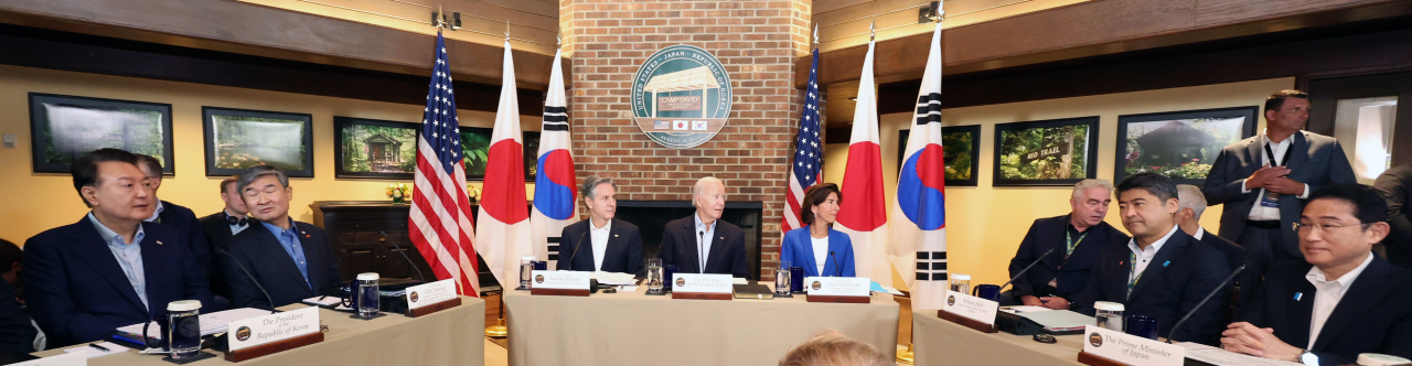 바이든 대통령은 윤석열 대통령과 기시다 후미오 일본 총리에게 “두 정상을 모시게 돼 영광”이라며 “캠프 데이비드에서 내가 외국 정상을 맞이하는 것은 이번이 처음”이라고 했다.