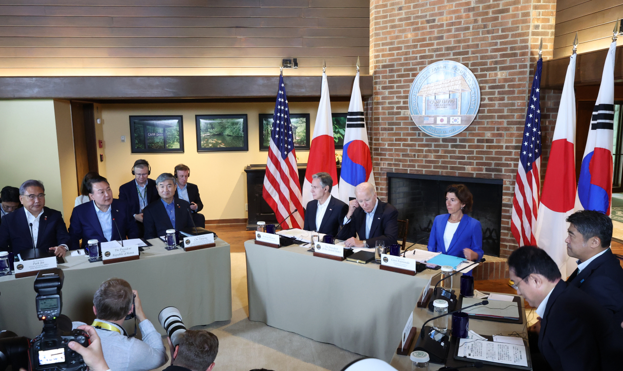 윤석열 대통령이 18일(현지시간) 워싱턴DC 인근 미국 대통령 별장인 캠프 데이비드의 로렐 로지에서 조 바이든 미국 대통령, 기시다 후미오 일본 총리와 한미일 정상회의를 하고 있다. [연합] |