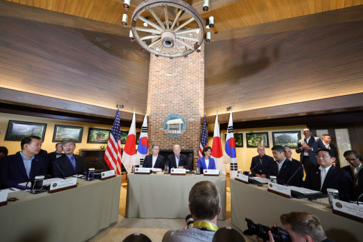 윤석열 대통령이 18일(현지시간) 워싱턴DC 인근 미국 대통령 별장인 캠프 데이비드의 로렐 로지에서 조 바이든 미국 대통령, 기시다 후미오 일본 총리와 한미일 정상회의를 하고 있다. (사진=연합뉴스) |