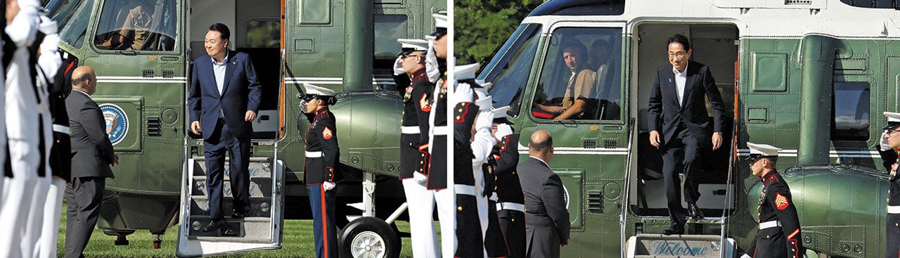 윤석열 대통령이 18일(현지 시각) 미국 워싱턴DC 인근 대통령 별장인 캠프 데이비드에 도착해 헬기에서 내리고 있다. 오른쪽 사진은 윤 대통령 도착 30분쯤 후 기시다 후미오 일본 총리가 헬기에서 내리는 모습. /뉴시스·로이터 뉴스1 |