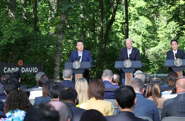 윤 대통령은 이날 오후 미국 워싱턴DC 인근 캠프 데이비드에서 조 바이든 미국 대통령, 기시다 후미오 일본 총리와 진행한 공동기자회견에서 "우리 세 정상은 처음으로 한·미·일 단독 정상회담을 갖고 한·미·일 협력의 새로운 장을 열었다"면서 이같이 말했다.