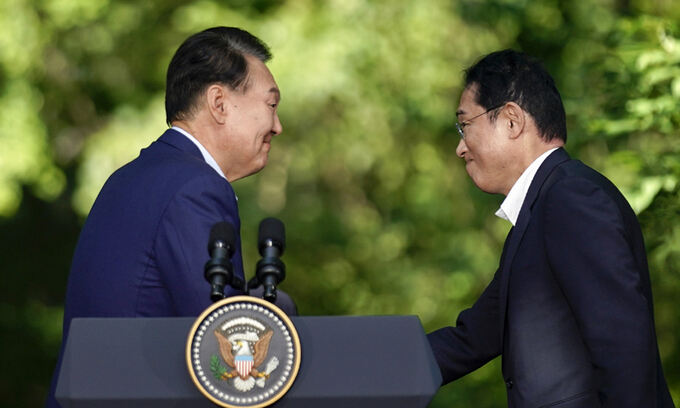악수하는 한·일 정상 윤석열 대통령과 기시다 후미오 일본 총리가 지난 18일(현지시간) 미국 워싱턴 인근 캠프데이비드에서 열린 한·미·일 정상회의 공동 기자회견 뒤 악수를 하고 있다. 캠프데이비드=AP연합뉴스 |