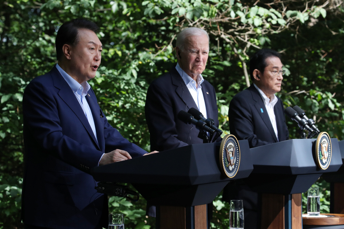 윤석열 대통령이 18일(현지시간) 메릴랜드주에 위치한 미국 대통령 별장 캠프 데이비드에서 조 바이든 미국 대통령, 기시다 후미오 일본 총리와 공동기자회견을 하고 있다. (뉴시스) |