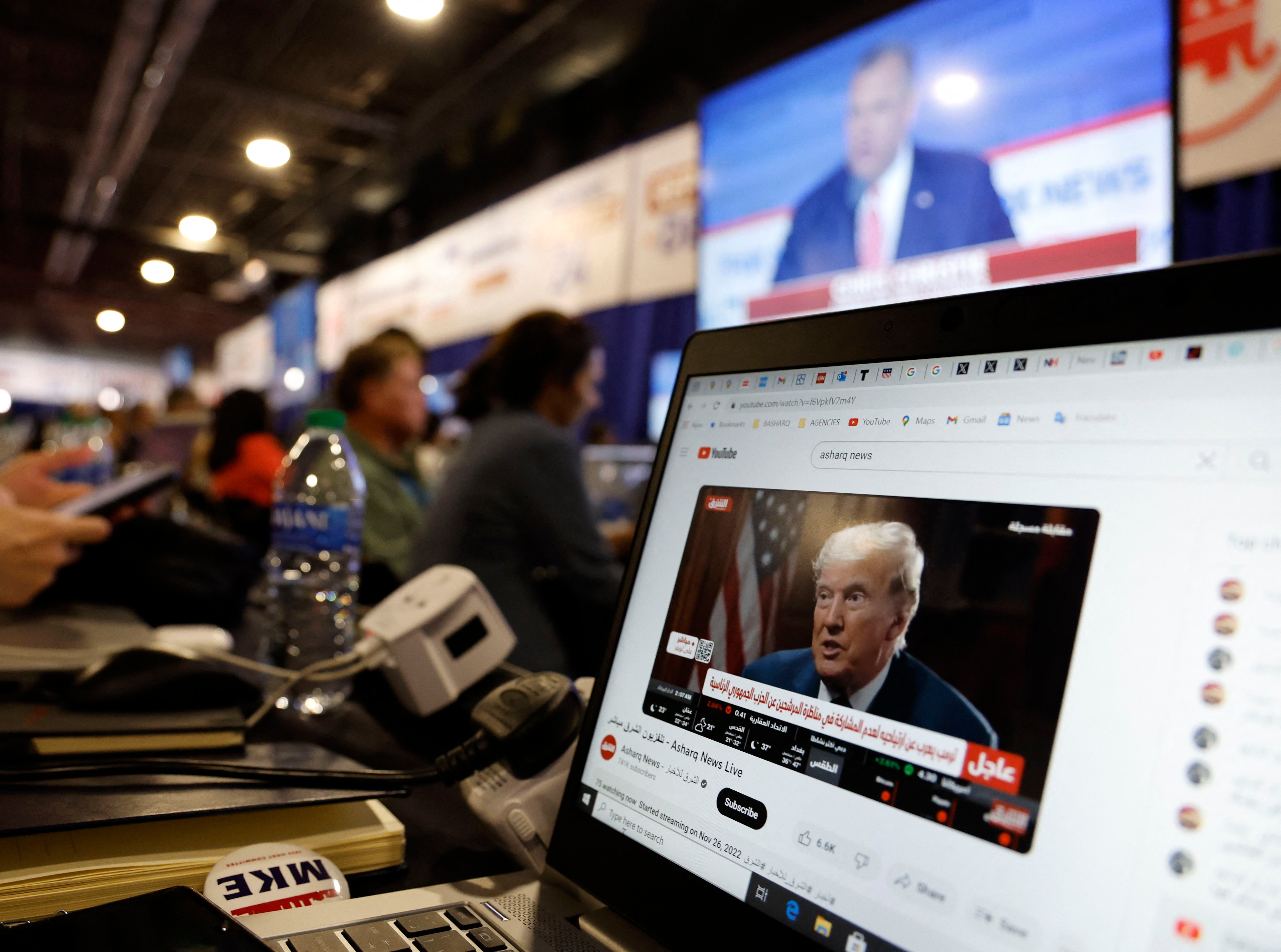 미국의 한 기자가 23일(현지 시각) 저녁 밀워키에서 열린 미 공화당 첫 대선 토론장 미디어센터에서 도널드 트럼프 전 대통령의 대담 인터넷 방송을 보고 있다. /로이터 연합뉴스 |