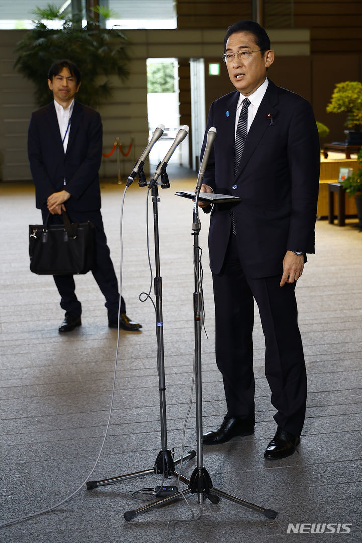 [도쿄=AP/뉴시스]중국이 일본산 전면 수입 금지에 나서자 기시다 후미오(岸田文雄) 일본 총리는 즉각 철폐를 요청했다. 사진은 지난 22일 기시다 총리가 도쿄 총리 관저에서 기자들의 질문에 답하고 있는 모습. 2023.08.25. |