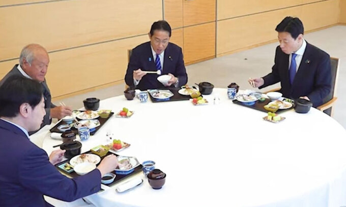 함께 식사한 니시무라 경제산업상은 기자단에 “여러 영향이 나타나고 있는 만큼 기시다 총리가 앞장서서 풍평(소문)에 대응하고 어업인을 지원하려는 강한 자세를 보여줬다”고 말했다. 일본 정부는 금주 중에 중국의 일본산 수산물 수입 금지에 따른 수산 사업자 보호책을 발표할 계획이다.