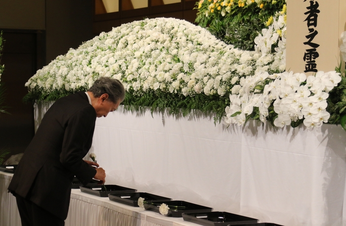하토야마 유키오 전 일본 총리가 1일 도쿄 국제포럼에서 열린 ‘제100주년 관동대진재 한국인 순난자 추념식’에서 조선인 희생자를 추도하며 헌화하고 있다. 연합뉴스 |