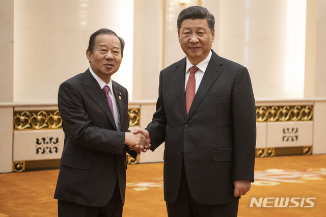 [베이징=AP/뉴시스]기시다 후미오 일본 총리의 기대에도 불구하고 니카이 도시히로 전 일본 집권 자민당 간사장의 조기 방중이 어려울 수 있다는 보도가 나왔다. 사진은 시진핑 중국 국가 주석(오른쪽)이 지난 2019년 4월 24일 베이징 인민대회당에서 니카이 도시히로 일본 자민당 간사장과 악수를 나누고 있는 모습. 2023.09.04. |