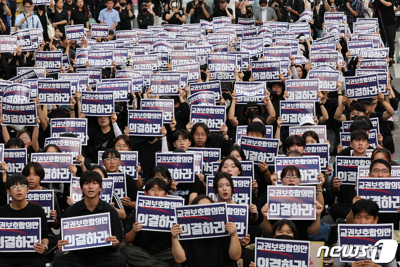 (서울=뉴스1) 박정호 기자 = 사망한 서이초 교사의 49재이자 '공교육 멈춤의 날'인 4일 오후 서울 여의도 국회의사당 앞에서 열린 서이초 교사 49재 추모집회에서 참석자들이 구호를 외치고 있다. 국회 앞에 모인 교사와 시민들은 극단적 선택을 한 서이초 교사 진상규명과 5개 교원단체가 합동 발표한 ‘교원보호 입법발의 공동안’ 의결, 안전하고 존중받는 교육환경 조성 등을 촉구했다. 2023.9.4/뉴스1