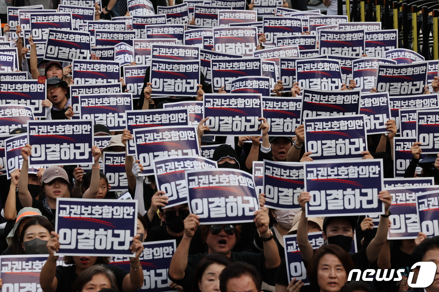(서울=뉴스1) 박정호 기자 = 사망한 서이초 교사의 49재이자 '공교육 멈춤의 날'인 4일 오후 서울 여의도 국회의사당 앞에서 열린 서이초 교사 49재 추모집회에서 참석자들이 구호를 외치고 있다. 국회 앞에 모인 교사와 시민들은 극단적 선택을 한 서이초 교사 진상규명과 5개 교원단체가 합동 발표한 ‘교원보호 입법발의 공동안’ 의결, 안전하고 존중받는 교육환경 조성 등을 촉구했다. 2023.9.4/뉴스1