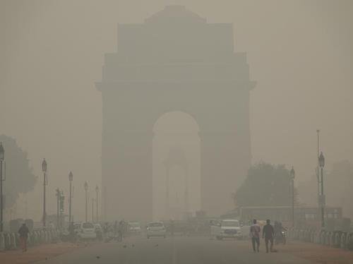 2019년 11월 4일 스모그가 가린 인도 수도 뉴델리의 상징물 인디아게이트. 불과 300m 떨어진 지점에서 촬영했지만, 형체가 흐릿하다. [연합뉴스] |