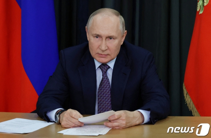 블라디미르 푸틴 러시아 대통령이 5일(현지시간) 소치에서 대통령 직속 승리 조직 위원회 화상 회의에 참석해 “러시아는 우크라이나 인과 싸우는 게 아니라 나치에 협력한 ‘반데라이트’ 괴물들과 그 추종자들을 상대로 특별 군사 작전을 추진하는 것”이라고 밝히고 있다./로이터=뉴스1 |