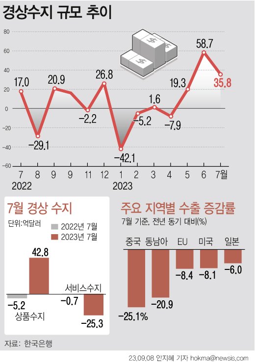 8일 한국은행이 발표한 2023년 7월 국제수지 잠정 통계에 따르면 7월 경상수지는 35억8000만달러 흑자를 기록했다. 서비스수지가 25억3000만달러 적자를 보였지만 상품수지와 본원소득수지가 각각 42억8000만달러, 29억2000만달러 흑자를 나타냈기 때문이다.