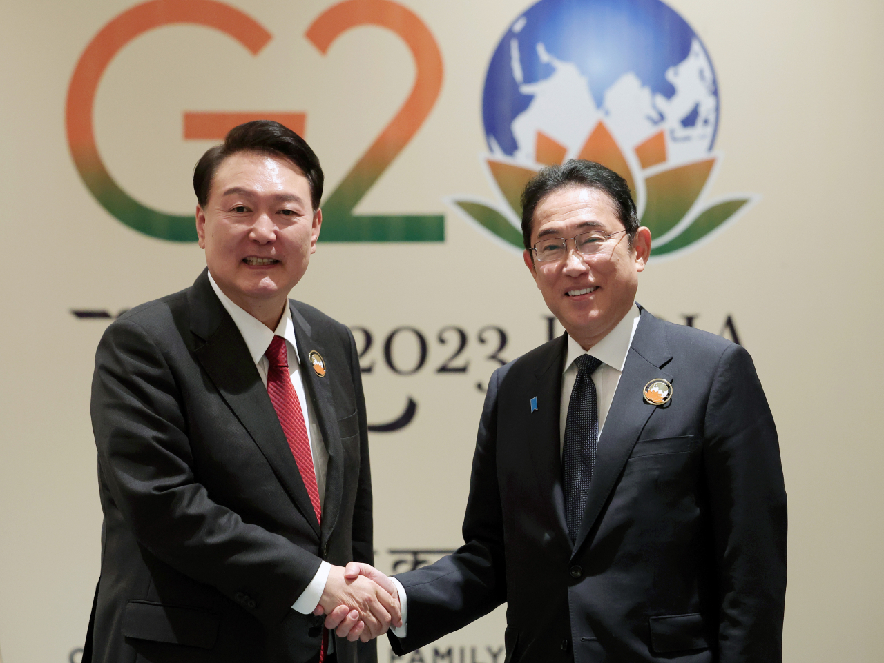 주요 20개국(G20) 정상회의에 참석 중인 윤석열 대통령이 10일(현지시간) 인도 뉴델리의 정상회의장인 바라트 만다팜에서 기시다 후미오 일본 총리와 한·일 정상회담을 하고 있다. [연합] |