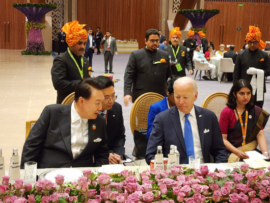 김은혜 대통령실 홍보수석은 10일(현지시간) 서면 브리핑을 통해 “윤 대통령과 바이든 대통령은 어제(9일) 저녁 인도 뉴델리 G20 정상회의장에서 열린 갈라 만찬에서 캠프 데이비드 정상회의와 관련해 이야기를 나눴다”고 밝혔다. 윤 대통령은 바이든 대통령과 나란히 옆자리에 앉아 한 시간 반 가량 대화를 나눴다.