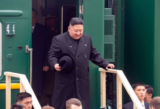 김정은 북한 국무위원장이 2019년 4월24일 전용 열차로 러시아와 북한의 접경 지역인 하산역에 도착, 열차에서 내리는 모습. [사진=연합뉴스] |