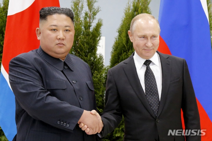 블라디미르 푸틴 러시아 대통령(오른쪽)과 김정은 북한 국무위원장이 2019년 4월25일 러시아 블라디보스토크에서 만나 악수하고 있다./AP=뉴시스 |