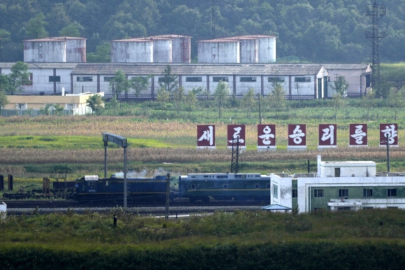 11일 김정은 국무위원장이 탑승한 것으로 보이는 열차가 북한과 러시아의 국경을 지나고 있다. 북한과 러시아는 이날 김 위원장이 블라디미르 푸틴 러시아 대통령과 정상회담을 위해 러시아를 방문할 것이라 발표했다. 2023.09.12 연합뉴스 |