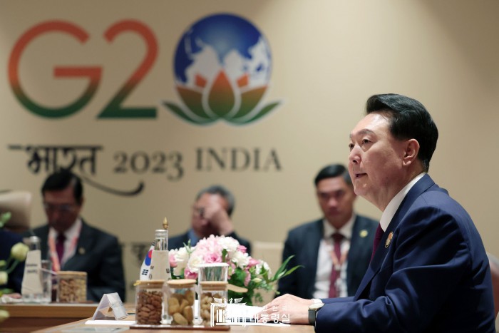 [서울=뉴스핌] 윤석열 대통령이 9일(현지시간) 뉴델리 바라트 만다팜 국제컨벤션센터에서 열린 한국과 멕시코, 인도네시아, 튀르키예, 호주로 구성된 협의체 '믹타'(MITKA) 회원국 정상회동에서 발언하고 있다.[사진=대통령실] 2023.09.09 photo@newspim.com |