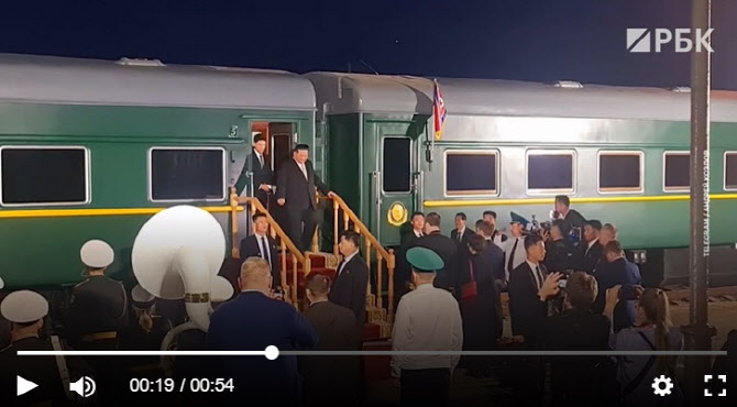12일 러시아 매체 RBK가 공개한 영상. 김정은 북한 국무위원장이 러시아 하산역에 도착해 러시아 간부들과 인사하고 있다. (사진=RBK캡처) |