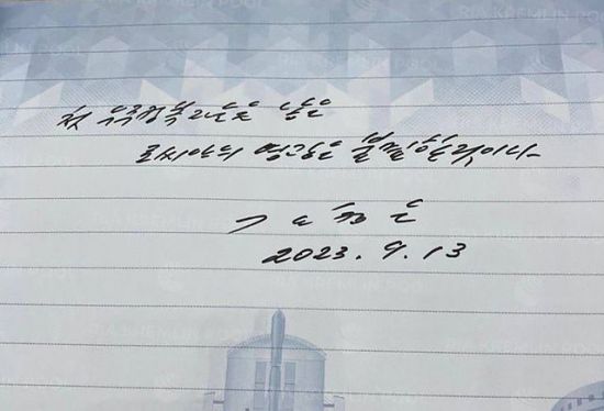 김정은 북한 국무위원장이 13일(현지시각) 러시아 아무르 주에 위치한 보스토니치 우주기지에 도착해 친필 메시지를 남겼다. [사진출처=스푸트니크 텔레그램 채널 갈무리] |