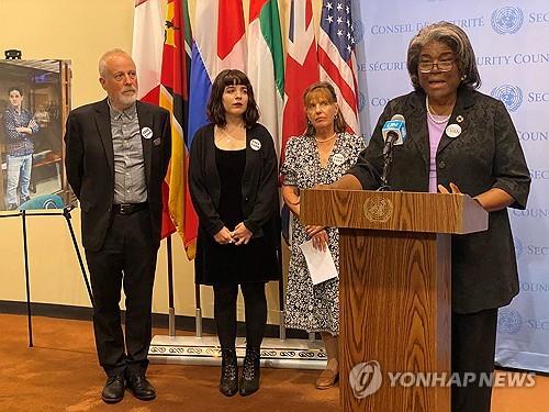 한편 토머스-그린필드 대사는 이날 약식회견장에 간첩 혐의로 러시아에 구금 중인 에반 게르시코비치 월스트리트저널(WSJ) 기자의 가족들과 함께 나와 "러시아의 에반 구금은 국제법 위반"이라며 그의 신속한 석방을 촉구했다.