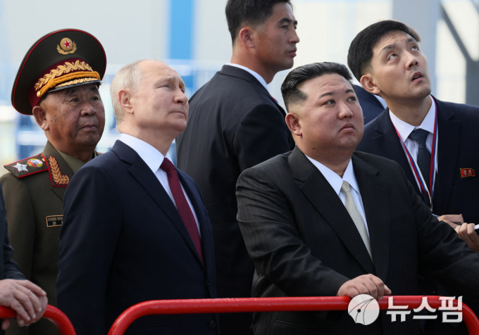 13일 오후 김정은 북한 국무위원장이 블라디미르 푸틴 러시아 대통령과 러시아 극동 아무르주 보스토치니 우주기지를 둘러 보는 모습. [사진=로이터 뉴스핌] |