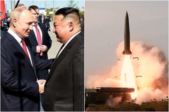 악수를 나누는 블라디미르 푸틴 러시아 대통령과 김정은 북한 국무위원장과 북한의 미사일 발사 모습 |