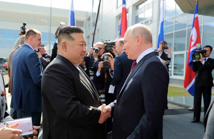 13일(현지 시각) 블라디미르 푸틴 러시아 대통령이 러시아 보스토치니 우주기지에서 북러 정상회담을 위해 러시아를 방문한 북한 김정은 국무위원장을 맞이하고 있다./뉴스1 |