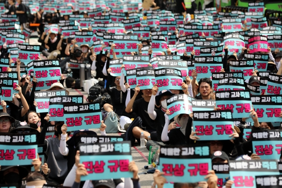 한자리 모인 전국 교사들 ‘교권 침해 학생 분리 및 다수 학생 학습권 보장 대책 마련 촉구’ - (서울=뉴스1) 이승배 기자 = 19일 오후 서울 여의도 국회 앞에서 열린 ‘무법지대에서 교육 안전지대로’ 국회 입법 촉구 추모 집회에 참여한 전국 교사들이 교사의 억울한 죽음 진상 규명, 아동학대 관련법 9월4일까지 개정, 실효적인 민원 처리 시스템 마련 등을 촉구하고 있다. 2023.8.19/뉴스1 |
