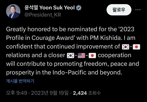 윤삭열 대통령은 SNS를 통해 매우 영광이라며 지속적인 한·일 관계 개선과 한·미·일 협력이 인도·태평양과 그 너머의 자유와 평화, 번영을 촉진하는 데 기여할 것으로 확신한다고 전했습니다.