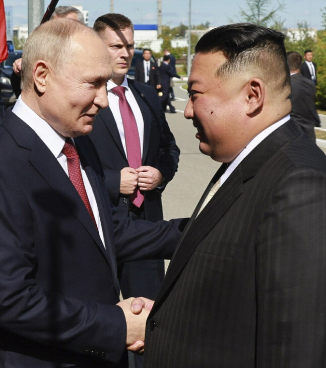 김정은(오른쪽) 북한 국무위원장과 블라디미르 푸틴 러시아 대통령이 13일(현지시간) 러시아 보스토치니 우주기지에서 만나 악수하고 있다.(사진=AP·연합뉴스) |