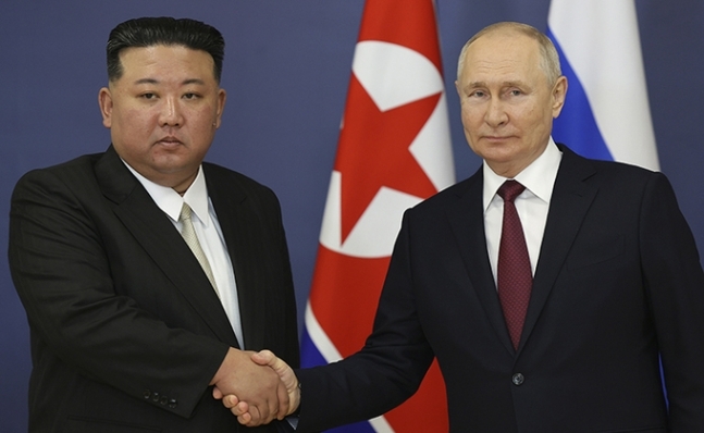 김정은(왼쪽) 북한 국무위원장이 13일(현지시각) 러시아 아무르주 보스토치니 우주기지에서 블라디미르 푸틴 러시아 대통령과 회담하면서 악수하고 있다. 보스토치니=AP/뉴시스 |