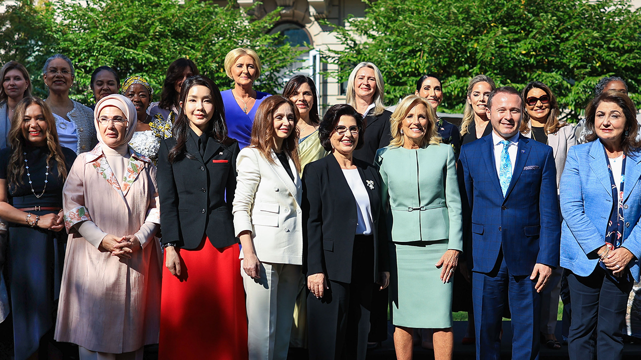 ▲ 김건희 여사가 20일(현지시간) 뉴욕 쿠퍼 휴잇 스미스소니언 디자인박물관에서 열린 미국 영부인 주최 리셉션에서 질 바이든 여사 등 각국 정상 배우자들과 기념 촬영을 하고 있다.