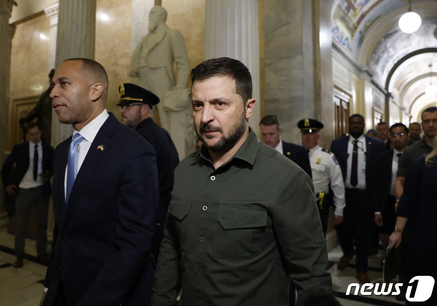 볼로디미르 젤렌스키 우크라이나 대통령(가운데)이 하킴 제프리스 미 하원 원내대표(왼쪽)과 21일(현지시간) 워싱턴DC의 국회의사당에 도착하고 있는 모습. 2023.09.21/뉴스1 ⓒ AFP=뉴스1 ⓒ News1 김민수 기자 |
