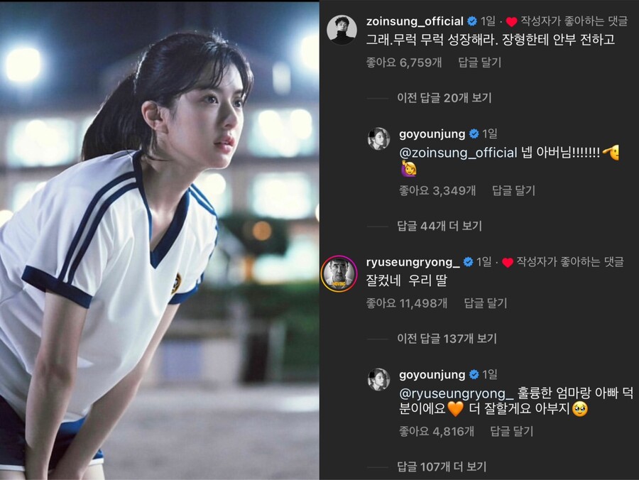 '무빙'에서 부녀 사이로 호흡을 맞춘 류승룡은 "잘 컸네 우리딸"이라는 댓글을 달아 뭉클함을 안겼고 이에 고윤정 역시 "훌륭한 엄마랑 아빠 덕분이에요. 더 잘할게요 아부지"라는 애교 넘치는 댓글로 부녀 케미를 보여줬다.