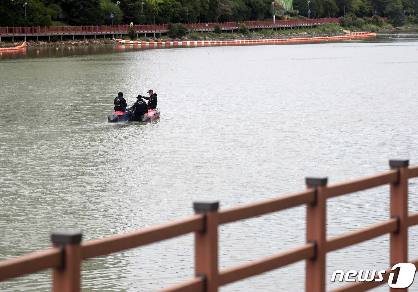 21일 오후 부산 수영강에서 소방대원들이 보트를 동원해 전날 온천천에서 폭우로 불어난 물에 휩쓸려 실종된 여성을 찾기 위한 수색작업을 하고 있다. 2023.9.21/뉴스1 ⓒ News1 윤일지 기자 |