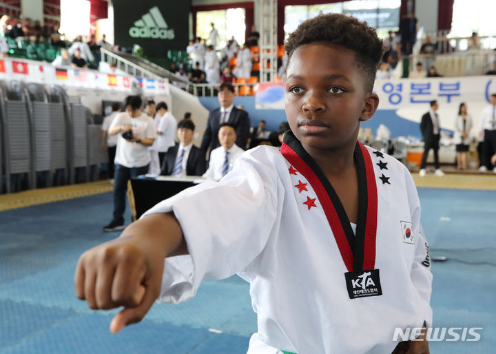 [서울=뉴시스] 권창회 기자 = 23일 오전 서울 강남구 국기원에서 열린 2023 외국인 태권도 경연대회에 참가한 어린이가 품새를 하고 있다. 2023.09.23. kch0523@newsis.com