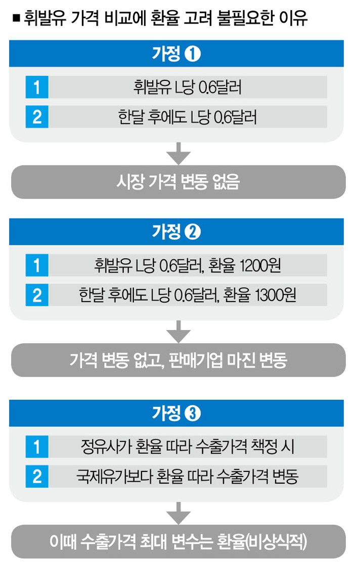 # 그러자 대한석유협회와 일부 독자는 다음과 같은 의견을 내놨습니다. "환율을 적용해서 다시 분석해야 한다." 수출가격과 내수가격을 비교하려면 환율을 고려해야 하는 것 아니냐는 겁니다.