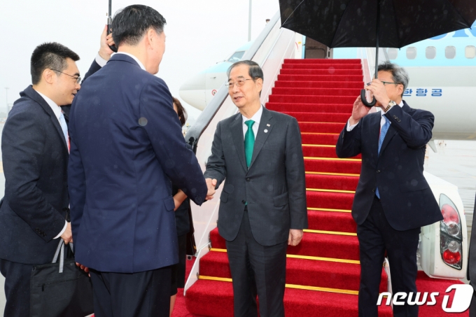 한덕수 국무총리가 중국 항저우에서 열리는 아시안게임 개회식에서 참석하기 위해 23일 오전 특별기편으로 항저우 샤오산 국제공항에 도착해 중국 정부 인사와 인사하고 있다./사진제공=국무총리실 |