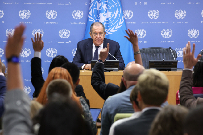 세르게이 라브로프 러시아 외무부 장관이 23일(현지시간) 미국 뉴욕 유엔본부에서 기자회견을 하고 있다./타스·연합뉴스 |