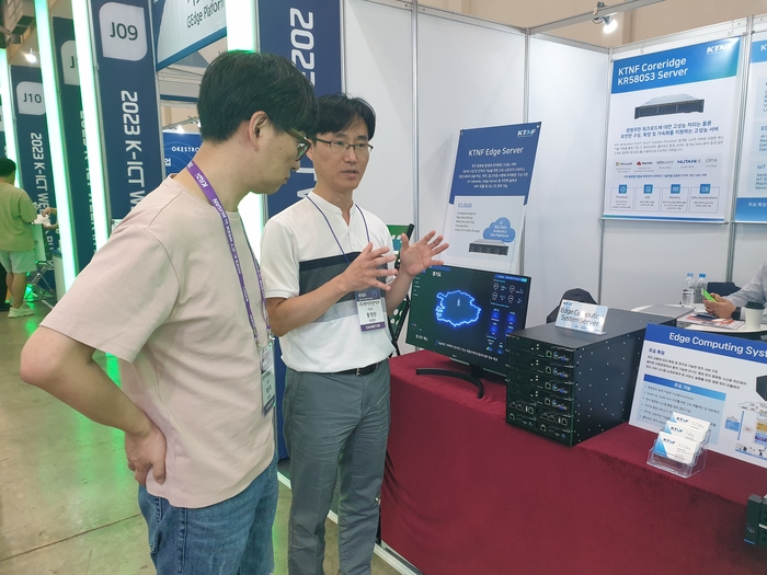 홍영찬 KTNF 이사가 클라우드 엑스포 코리아에서 관람객에게 '러기드 에지 서버 시스템' 제품을 설명하고 있다. |