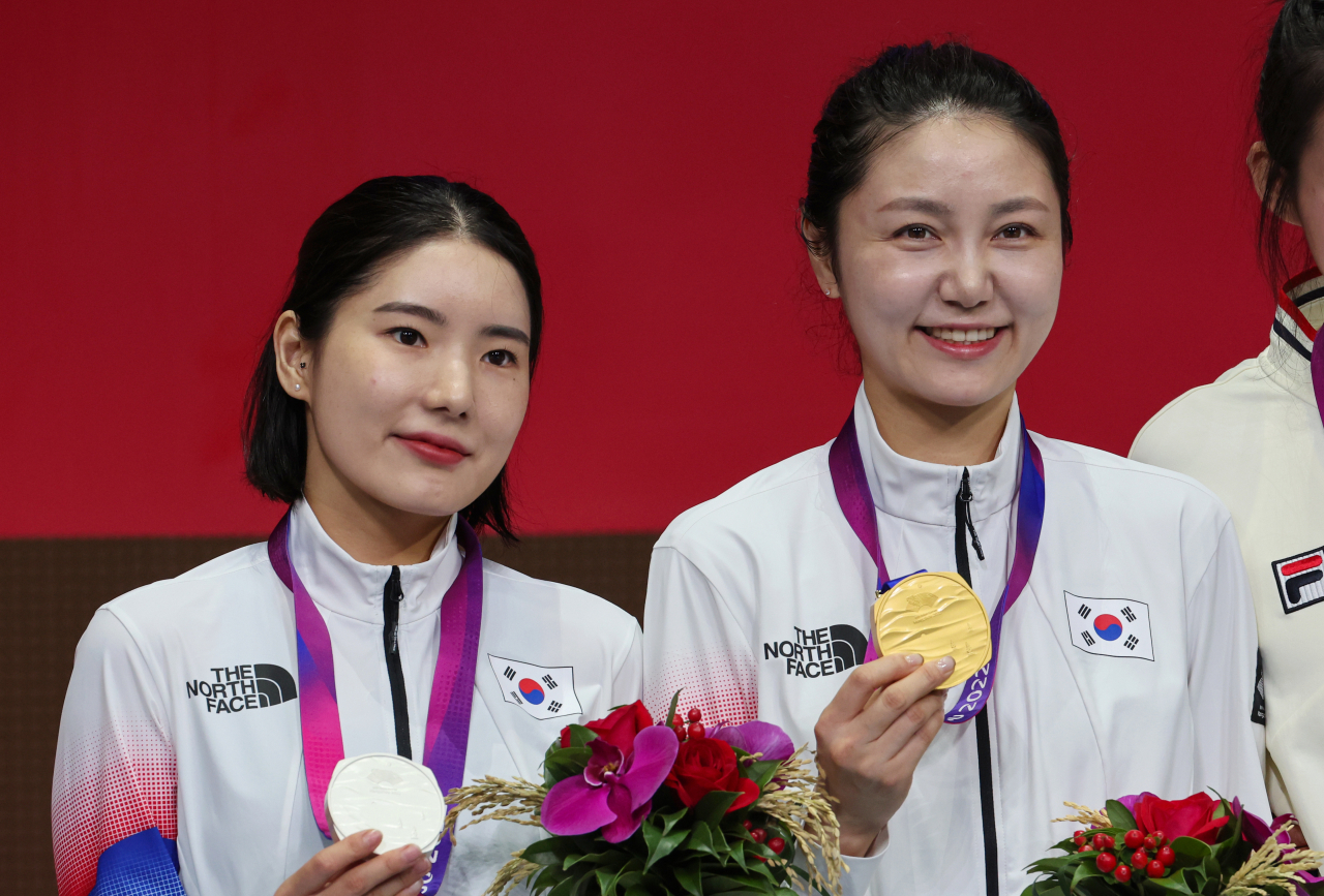 24일 중국 항저우 전자대학 체육관에서 열린 항저우 아시안게임 여자 에페 개인전에서 금메달를 딴 최인정(오른쪽)과 은메달을 딴 송세라가 기념 촬영하고 있다. [연합] |