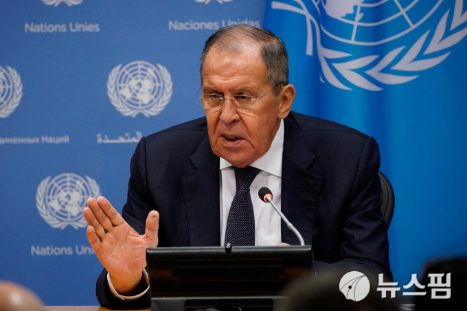 지난 23일(현지시간) 미국 뉴욕 유엔 본부에서 열린 제78회 유엔 총회에서 기자회견하는 세르게이 라브로프 러시아 외무장관의 모습. [사진=로이터 뉴스핌] |